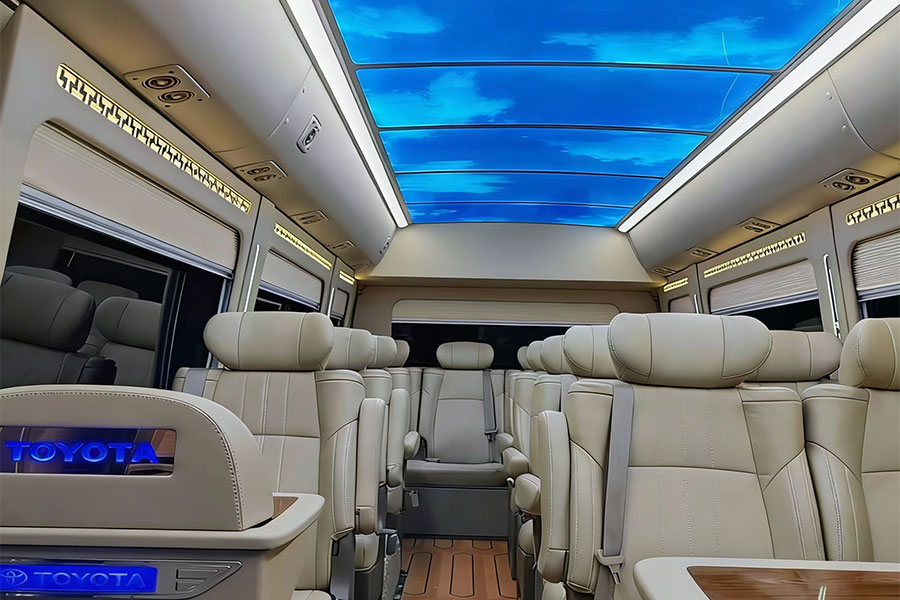 我们主打的是高端20座丰田考斯特,车辆都是准新车状态,日常精细保养、深度清洁,车内干净整洁,空间宽敞通透,十几人乘坐绝不拥挤。内饰做了顶配升级,改装豪华阿尔法座椅,久坐不累,还加装了氛围感星空顶,档次感拉满;更专为商务接待配置老板办公桌、秘书专座,搭配全车无线充电功能,接待贵宾、途中办公都十分便捷,商务气场十足,长途出行也不会觉得压抑疲惫。